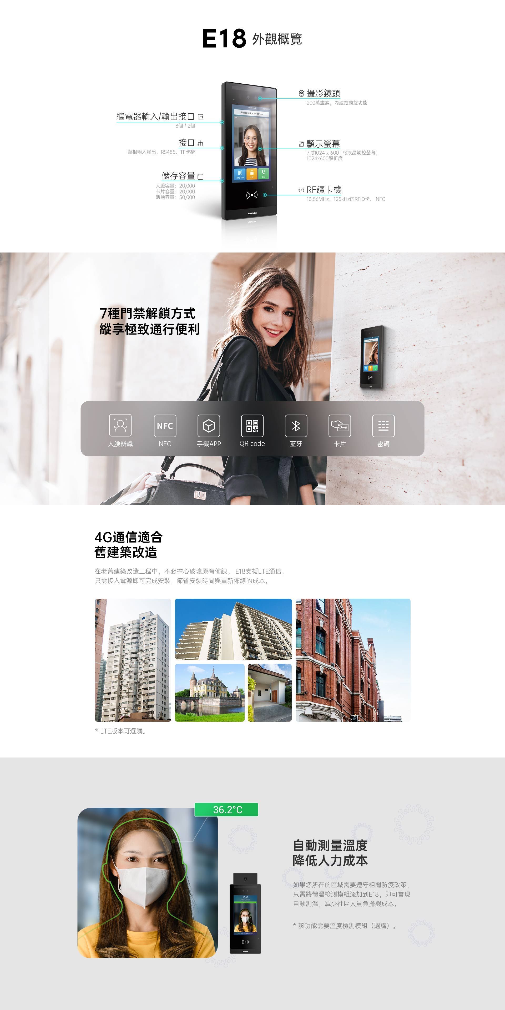 - 多種門禁功能,包括:人臉、卡片、密碼、藍牙低功耗 (BLE) 和 QR 碼。