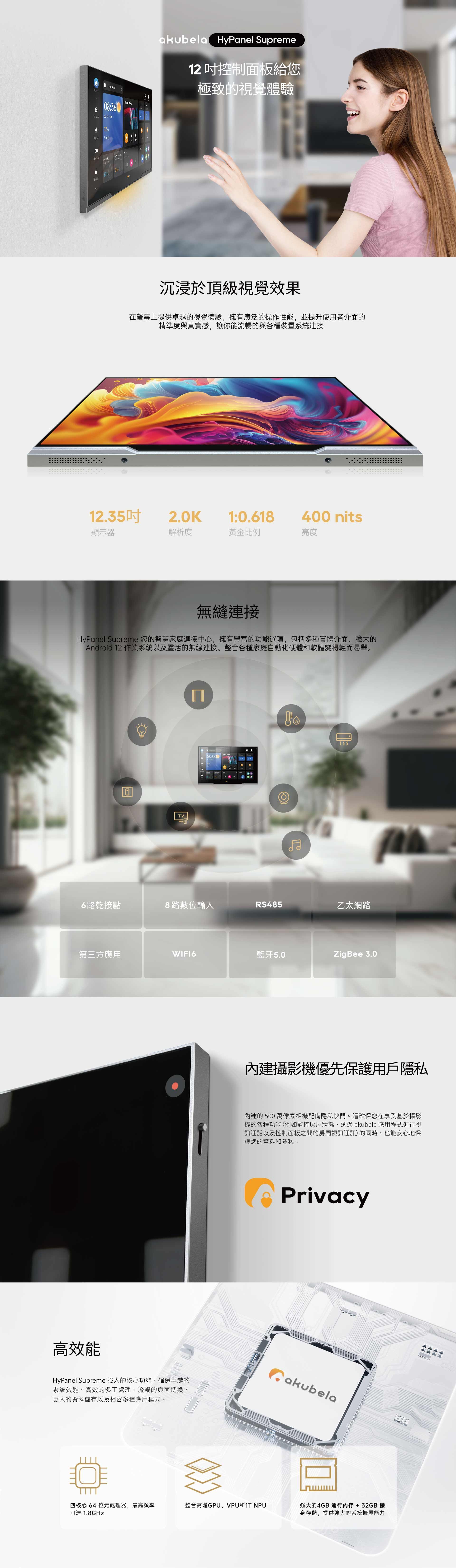 HyPanel Supreme 是一款12.35 吋的智能家居控制中心,配備了高解析度 2560×1600分辨率螢幕和超薄邊框。其極簡金屬外觀完美融入現代高端居家風格,打造出令人驚豔的視覺體驗。搭載 Android 12 作業系統,支援多種智慧家庭控制應用程式,並可流暢整合第三方應用與原生介面,實現真正的智慧網路。內建多種