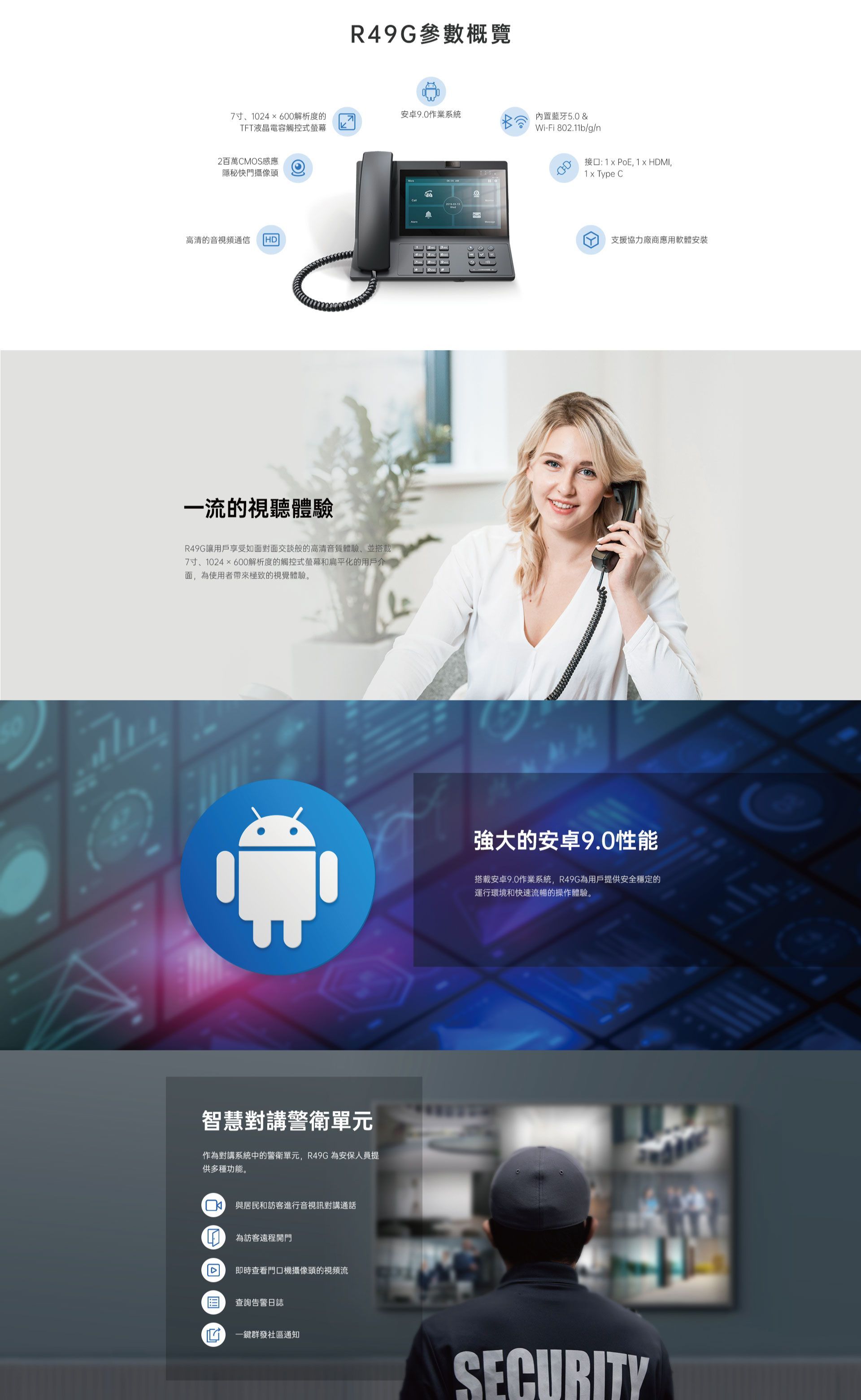 R49G 是一款基於 Android 系統的多媒體終端,配備 7 吋觸控螢幕與200 萬畫素 CMOS 感測器攝影機。支援 H.264/H.263 編碼,具備自適應頻寬調整功能。7 吋觸控螢幕帶來優異的使用體驗,包括高品質視訊通話、流暢的網路瀏覽、各類 Android 應用以及日常資訊查詢等。
