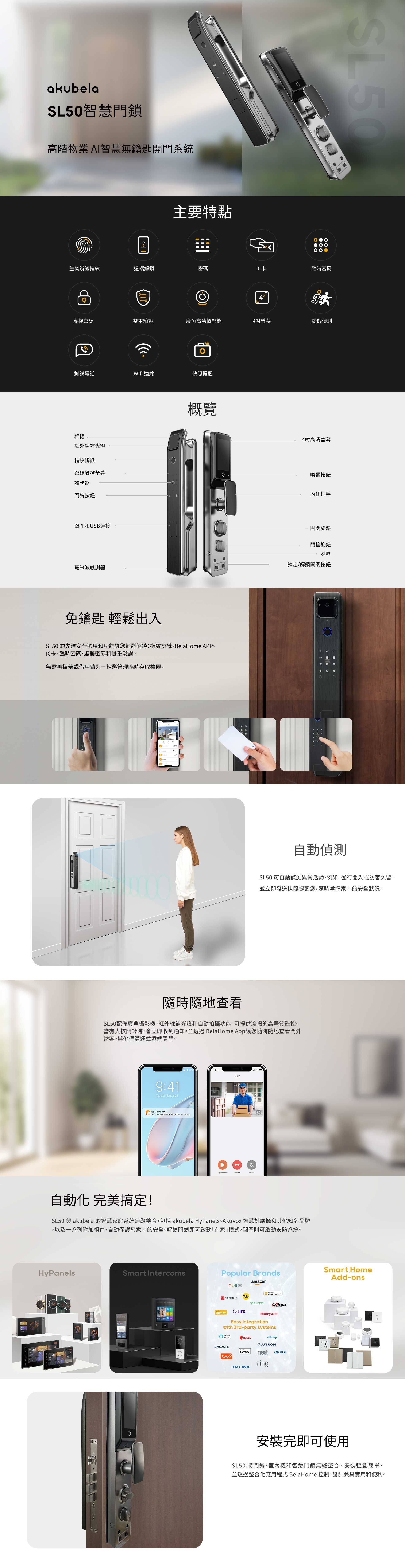 akubela SL50 智慧鎖配備可視貓眼功能,能夠即時觀察門外情況,並結合毫米波雷達進行主動監控,一旦發現可疑活動立即主動警報。它採用先進的指紋辨識技術,確保開鎖準確舒適,同時支援密碼、M1 卡與客戶端遠端開門等多種方式,並具備全自動開鎖功能,讓每次回家都充滿儀式感。
